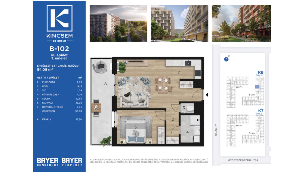 Budapest, Gyógyszergyári utca Kincsem LakóparkÁr: 66913000 FtTerület: 54.08 m²Szobák: 2Emelet: 1Azonosító: K6-B102Részletek