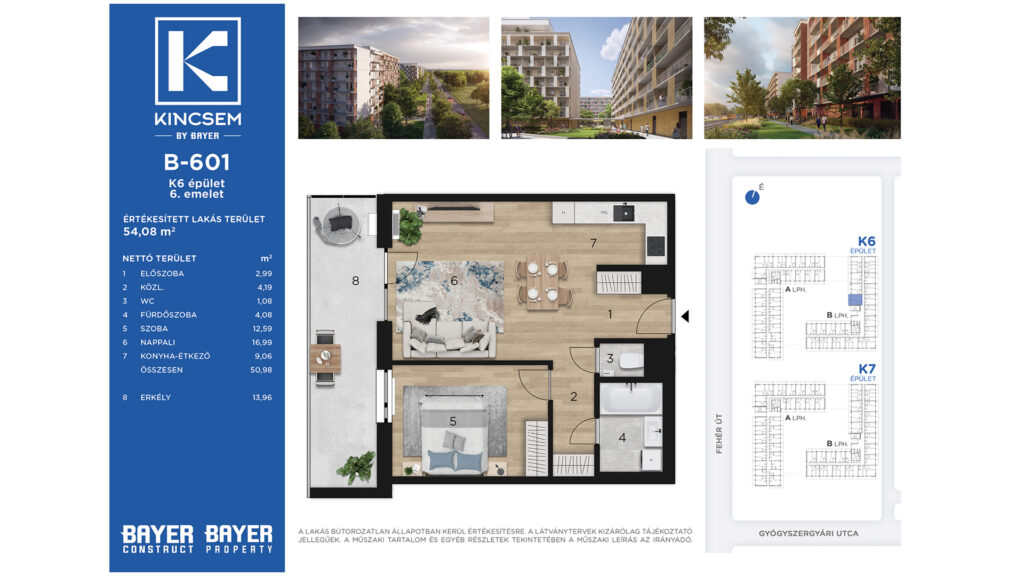 Budapest, Gyógyszergyári utca Kincsem LakóparkÁr: 71195960 FtTerület: 54.08 m²Szobák: 2Emelet: 6Azonosító: K6-B601Részletek