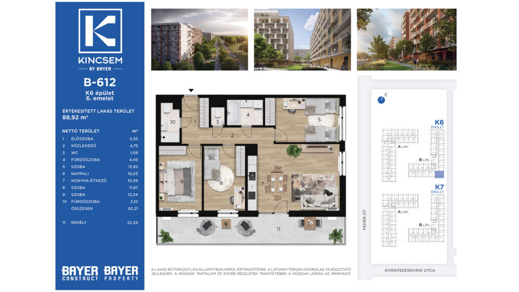 Budapest, Gyógyszergyári utca Kincsem LakóparkÁr: 92288193 FtTerület: 82.17 m²Szobák: 4Emelet: 6Azonosító: K6-B605Részletek
