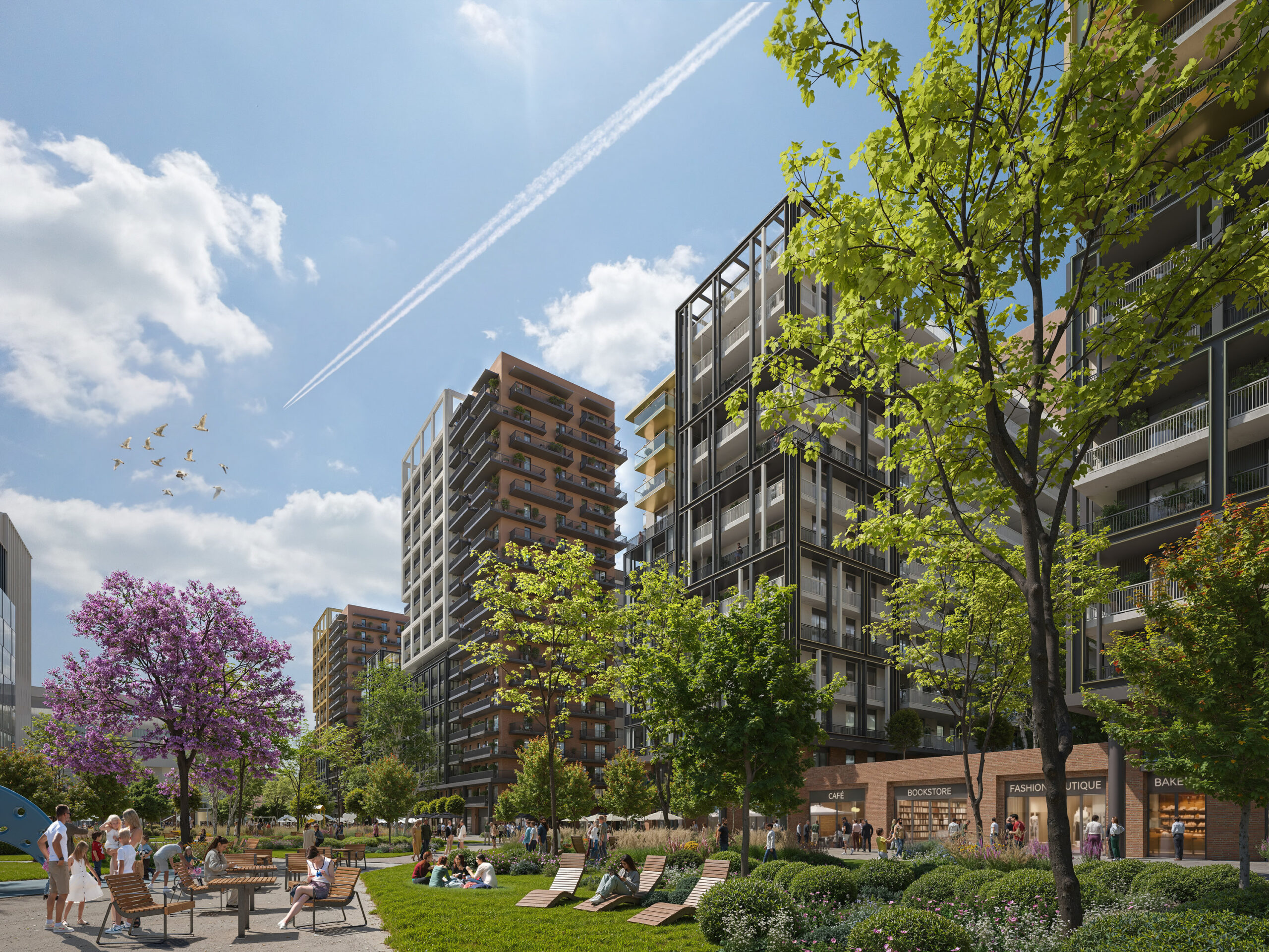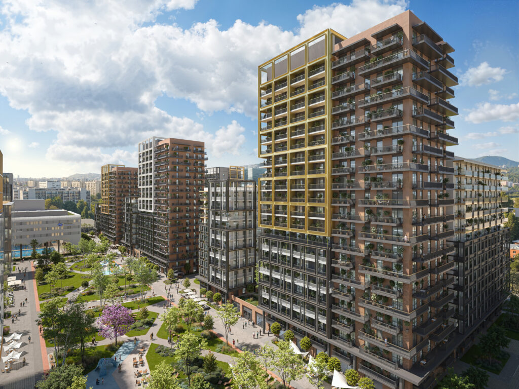 A területen modern irodaházak is épülnek BREEAM és WELL minősítéssel, valamint mennyezeti hűtés–fűtés rendszerekkel. A rugalmas, természetes fényű irodák parkra néző kilátással és kiváló megközelíthetőséggel biztosítanak vonzó munkakörnyezetet.