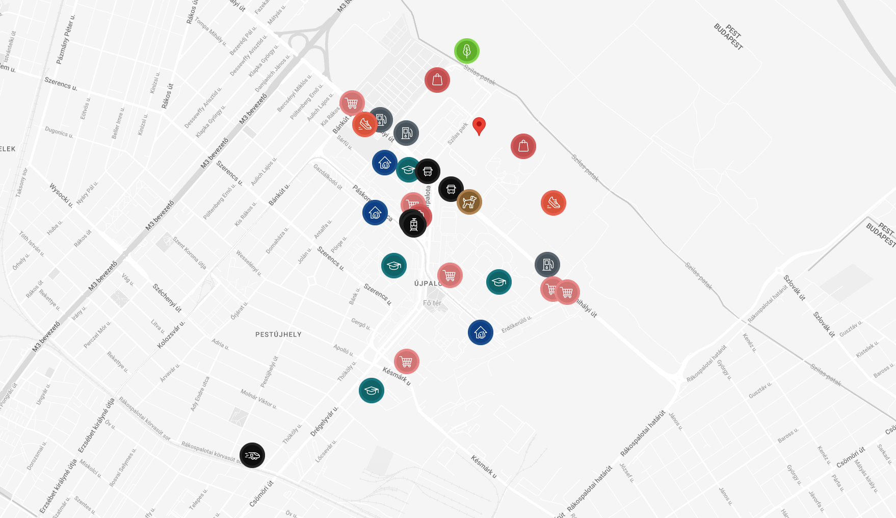 A közeli boltok között kiemelendő az Pólus Center és World Mall bevásárlóközpont, ahol megtalálhatóak a nagyobb élelmiszerboltok, szolgáltatások, de a közvetlen környezetben kisebb üzletek és piacok, óvodák, iskolák is könnyen elérhetők.