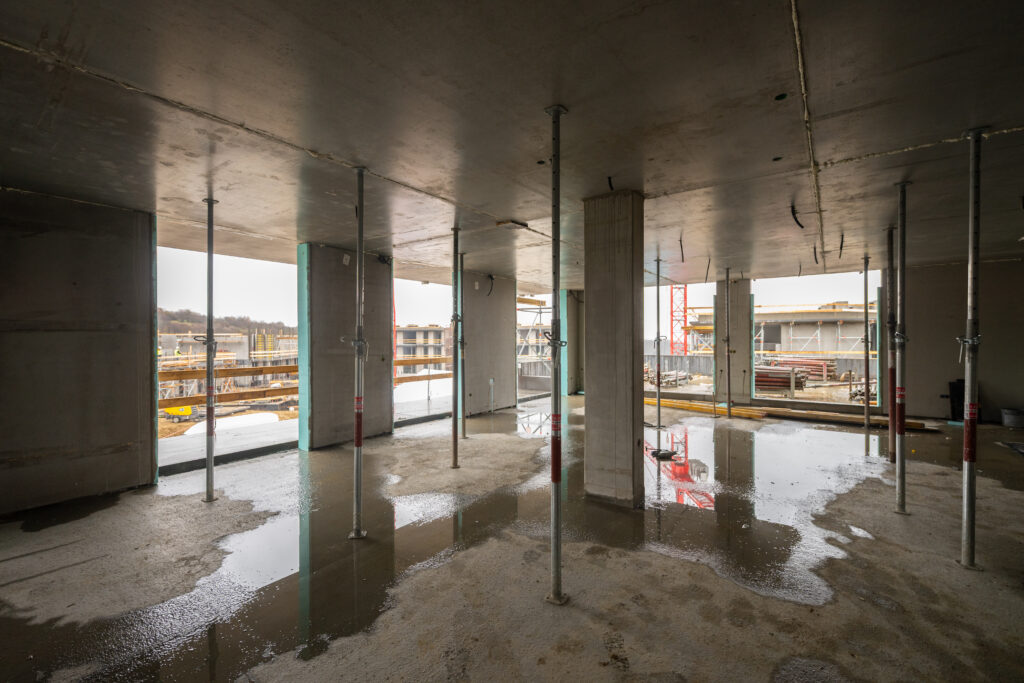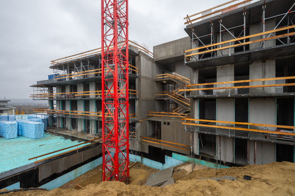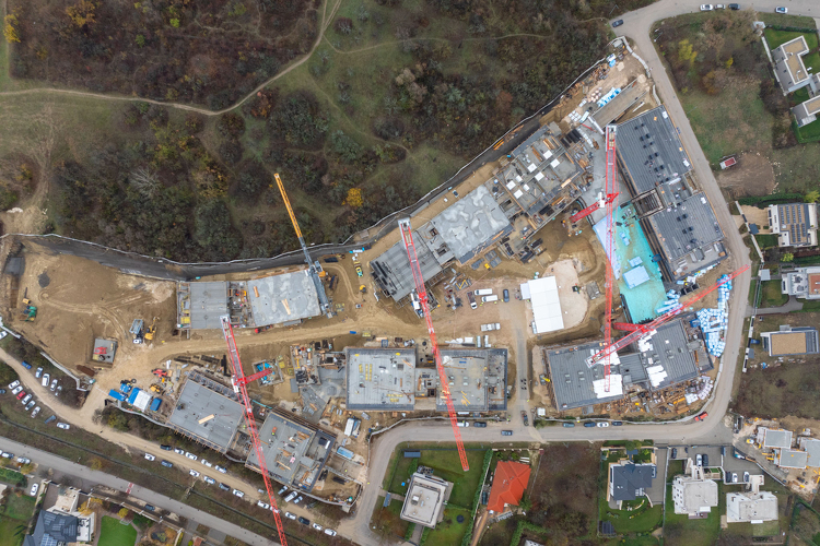 Nem több ütemben, hanem egyszerre, azonos időben zajlik a hét épület kivitelezése, amelyeknél bár az alapozási földmunkák a domborzati viszonyok miatt az átlagosnál komplexebb feladatot jelentettek, mára már négy épülettömb szerkezetkész.